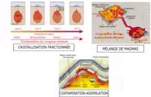 Plusieurs travaux, tels que la co-solidification d'enclaves dans leur encaissant[7],[8], la forme des enclaves déformées dans un état suffisamment mou avec l'encaissant[9], ont fourni des preuves de l'existence de mélange de magma expliquant l'évolution chimique des magmas par différenciation.