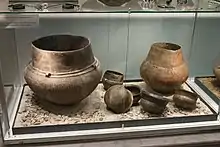 Poterie de la culture des tumulus. À gauche : jarre de stockage de Dobřany. À droite : céramiques provenant d'un dépôt à Lelov près de Stod. Musée de Bohême occidentale à Plzeň.