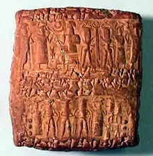 - 2000-1800 av. J.-C. : bronze moyen II en Anatolie[5]. Les archives des colonies marchandes assyriennes écrites en akkadien découvertes à Hattusa, Ankuwa et Kültepe font entrer l’Anatolie dans l’Histoire. Les Assyriens achètent de la laine, du cuivre, et vendent aux Anatoliens de l’étain et des tissus fins[6]. L’onomastique montre qu’au début du IIe millénaire av. J.-C., trois groupes occupent l’Anatolie : les proto-hittites, ou Hattis, qui rassemblent toutes les populations établies de longue date et qui ont souvent fusionné. Ensuite les Hourrites, numériquement dominant dans certaines régions, parfois maîtres de cités. Enfin les Hittites qui parlent des langues apparentées comme le nésite (« langue de Nesha »), le palaïte et le louvite, que l’on retrouve dans les territoires occidentaux[7]. Les Hittites, peuple indo-européen venu de l’est de l’Europe par le Bosphore ou le Caucase sont arrivés, au moins pour certains d’entre eux (louvites), au IIIe millénaire av. J.-C.[5], comme le suggèrent les affinités profondes existant entre la civilisation hittite et celles de cités comme Alaca Hüyük. Le mot « Hittite » regroupe trois peuples (luwili, palaumnili, nashili) arrivés à des époques différentes mais parlant des langues très proches. C’est par petits groupes, sporadiquement, qu’ils se sont installés au pays des Hattis[6]. L’impression domine donc qu’ils n’ont représenté qu’une minorité et leur langue ne comporte pas plus de 20 % de mots indo-européens. Les Hittites adoptent un système hiéroglyphique propre de 400 signes environ, mis lentement en place à partir du début du IIe millénaire av. J.-C. Il est utilisé dans les inscriptions monumentales ou dans les sceaux à partir du XIVe siècle av. J.-C. Il survivra un peu à l’effondrement de l’empire, mais n’aura pas de réelle postérité.