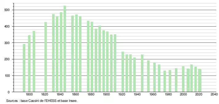 L'évolution du nombre d'habitants est connue à travers les recensements de la population effectués dans la commune depuis 1793. Pour les communes de moins de 10 000 habitants, une enquête de recensement portant sur toute la population est réalisée tous les cinq ans, les populations légales des années intermédiaires étant quant à elles estimées par interpolation ou extrapolation[22]. Pour la commune, le premier recensement exhaustif entrant dans le cadre du nouveau dispositif a été réalisé en 2005[23].