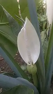 Les inflorescences, qui naissent à l'aisselle des feuilles, sont des spadices, enveloppés d'une spathe blanc verdâtre de 12 à 15 cm de long, qui forme à sa base une chambre sphérique fermée. Le spadice, blanc, légèrement plus long que la spathe, porte de nombreuses fleurs, femelles à la base, mâles dans la partie supérieure, et est stérile dans la partie médiane. Ces inflorescences sont rarement fertiles. Les fruits sont de petites baies jaunes[5],[6].