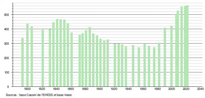 L'évolution du nombre d'habitants est connue à travers les recensements de la population effectués dans la commune depuis 1793. Pour les communes de moins de 10 000 habitants, une enquête de recensement portant sur toute la population est réalisée tous les cinq ans, les populations légales des années intermédiaires étant quant à elles estimées par interpolation ou extrapolation[26]. Pour la commune, le premier recensement exhaustif entrant dans le cadre du nouveau dispositif a été réalisé en 2008[27].