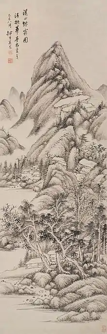 - Paysage de montagne dans le style de Wang Yuanqi, daté 1796, encre et couleurs légères sur papier, signé.
