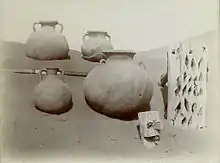 Jarres et bois travaillé. Antique cité de Karadong Ve siècle - IIIe siècle avant notre ère. Taklamakan, ancienne vallée de la Keriya. Photo Aurel Stein 1906, International Dunhuang Project[12].