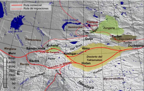Sa situation géographique en Asie centrale faisant du Turkestan oriental une zone de passage, de nombreuses ethnies y cohabitent, à la suite des diverses vagues de colonisation qui se sont succédé : populations de langues indo-européennes (Tokhariens et Sakas, ces derniers étant de langue iranienne) originellement nomades et qui se sont sédentarisées dans cette région, puis populations xiongnu, proto-turques, turques et enfin de langues proto-mongoles.