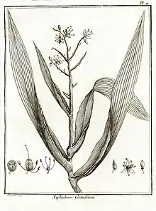 « XIPHIDIUM (cœruleum) floribus paniculatis, flore & foliis piloſis. (Tabula 11.)Planta perennis. Radix obliqua, geniculata, fibroſa. Caulis ſimplex, cylindraceus, hirſutus, pedalis & ampliùs. Folia alterna, remota, plana, ſtriata, longa, acuta, ſerrulata. Flores paniculati, terminales. Pedunculus cujuſque floris, squamula ad baſim munitur.
