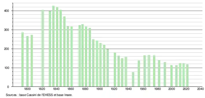 L'évolution du nombre d'habitants est connue à travers les recensements de la population effectués dans la commune depuis 1793. Pour les communes de moins de 10 000 habitants, une enquête de recensement portant sur toute la population est réalisée tous les cinq ans, les populations légales des années intermédiaires étant quant à elles estimées par interpolation ou extrapolation[16]. Pour la commune, le premier recensement exhaustif entrant dans le cadre du nouveau dispositif a été réalisé en 2006[17].