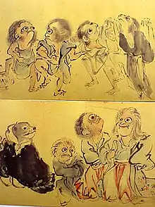 - Le tanuki(chien viverrin) 狸 : Bake-danuki (化け狸)"Tanuki métamorphe", Mamedanuki (豆狸) "Tanuki-haricot"(Certains traits étaient partagés avec le blaireau, comme le bake-mujina 化け狢, aujourd'hui appelé Mujina 狢).