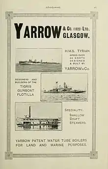 La société Yarrow a été l'un des premiers constructeurs mondiaux de destroyers et de frégates, construisant des navires pour la Royal Navy et de nombreux clients à l'exportation. Pendant de nombreuses années jusqu'aux années 1960, Yarrow a également construit un grand nombre de navires marchands, se spécialisant notamment dans les bateaux fluviaux pour les fleuves et les lacs de Birmanie, d'Inde, d'Afrique et d'Amérique du Sud.