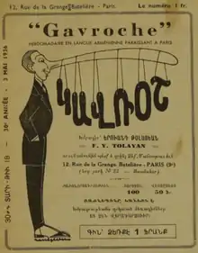 - François Yervant Tolayan, « Gavroche se présente », Gavroche, Paris, no 49, , p. 1 (lire en ligne [PDF])