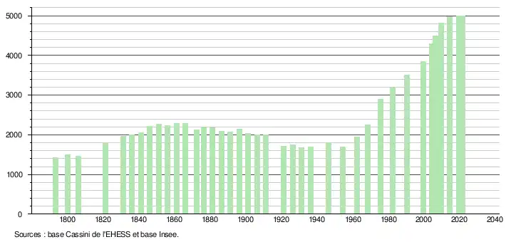 L'évolution du nombre d'habitants est connue à travers les recensements de la population effectués dans la commune depuis 1793. Pour les communes de moins de 10 000 habitants, une enquête de recensement portant sur toute la population est réalisée tous les cinq ans, les populations légales des années intermédiaires étant quant à elles estimées par interpolation ou extrapolation[29]. Pour la commune, le premier recensement exhaustif entrant dans le cadre du nouveau dispositif a été réalisé en 2004[30].