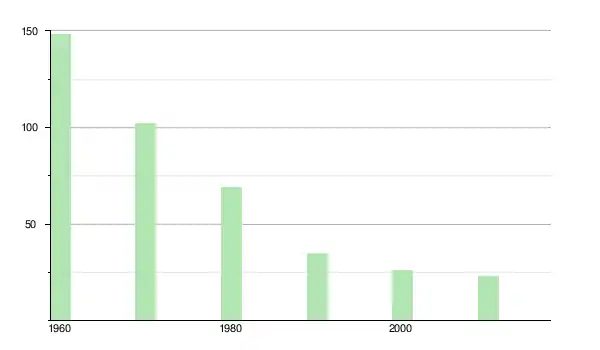 | 1970 | 102 | ▼ −31,08 % | |