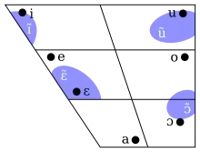 (les points noirs indiquent les voyelles orales, les régions colorisées indiquent les voyelles nasales)