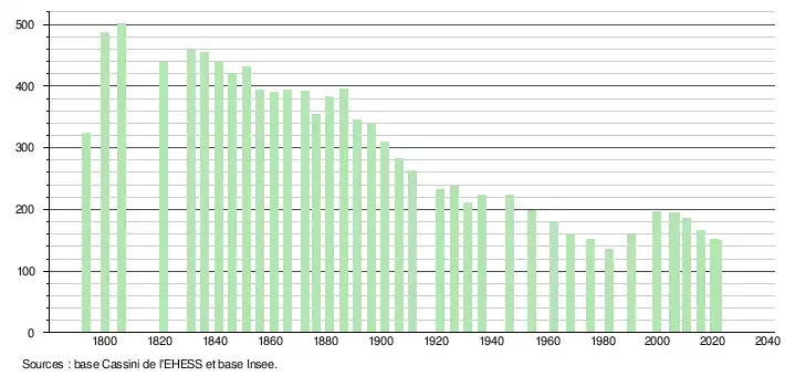 L'évolution du nombre d'habitants est connue à travers les recensements de la population effectués dans la commune depuis 1793. Pour les communes de moins de 10 000 habitants, une enquête de recensement portant sur toute la population est réalisée tous les cinq ans, les populations légales des années intermédiaires étant quant à elles estimées par interpolation ou extrapolation[16]. Pour la commune, le premier recensement exhaustif entrant dans le cadre du nouveau dispositif a été réalisé en 2005[17].