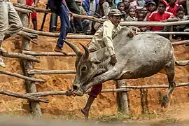 À Madagascar, il existe un sport appelé savika, sorte de tauromachie sans mise à mort du zébu. Le principe est de s'agripper avec ses mains sur la bosse du dos du zébu et d'utiliser ses jambes comme des ressorts pour éviter de se faire piétiner par l'animal. Ceux qui pratiquent ce sport sont appelés les mpisavika[5]. Par ailleurs, l'équipe de Madagascar de football porte aujourd'hui le nom d'une race de zébus appelée « Barea » qui a sa part d'histoire pour les Malgaches[6].