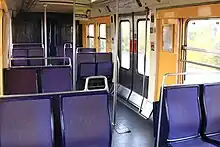 Intérieur d'une rame MI 79 rénovée. À gauche de la photo, un casier à bagages est disponible. Cette transformation sera abandonnée avant la fin de la rénovation.