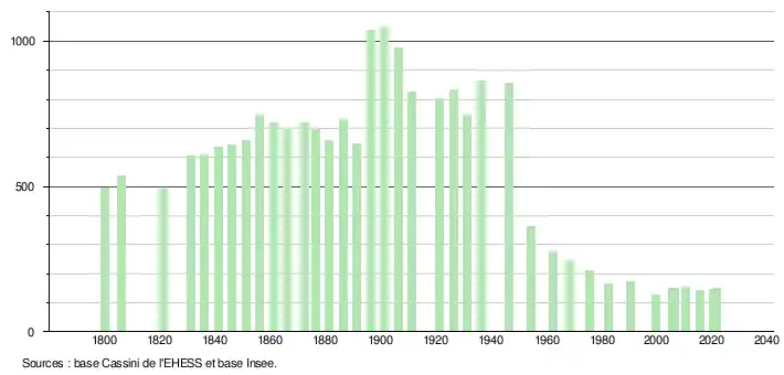 L'évolution du nombre d'habitants est connue à travers les recensements de la population effectués dans la commune depuis 1800. Pour les communes de moins de 10 000 habitants, une enquête de recensement portant sur toute la population est réalisée tous les cinq ans, les populations légales des années intermédiaires étant quant à elles estimées par interpolation ou extrapolation[9]. Pour la commune, le premier recensement exhaustif entrant dans le cadre du nouveau dispositif a été réalisé en 2005[10].