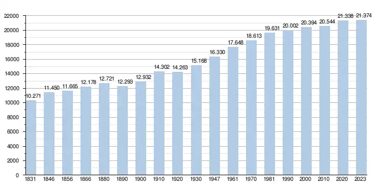 Elle comptait, au , 21 333 habitants (10 584 hommes et 10 749 femmes), soit une densité de 645,28 habitants/km²[3] pour une superficie de 33,06 km².