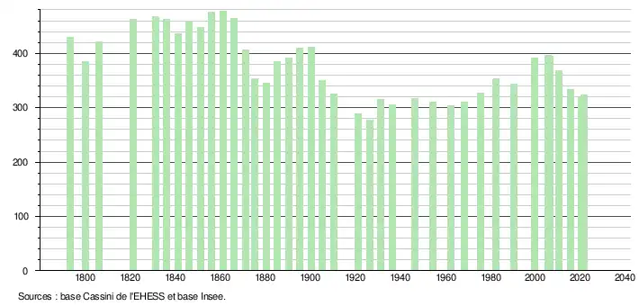 L'évolution du nombre d'habitants est connue à travers les recensements de la population effectués dans la commune depuis 1793. Pour les communes de moins de 10 000 habitants, une enquête de recensement portant sur toute la population est réalisée tous les cinq ans, les populations légales des années intermédiaires étant quant à elles estimées par interpolation ou extrapolation[20]. Pour la commune, le premier recensement exhaustif entrant dans le cadre du nouveau dispositif a été réalisé en 2005[21].