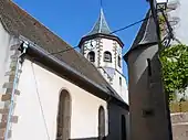 Le clocher renferme une des plus vieilles cloches d'Alsace (1410)[26],[27]. D'une hauteur de 1,29 m et d'un diamètre de 1,17 m, elle pèse 1 122 kg. Portant une fêlure de 38 cm, la cloche a été réparée en 1903. Les deux autres cloches datent de 1921 et remplacent celles réquisitionnées par les Allemands en 1917.