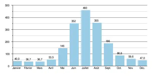 Le débit moyen mensuel observé en février-mars (minimum d'étiage) est de 36,7 m3/s, soit moins d'un douzième du débit moyen du mois de juillet (460 m3/s), ce qui témoigne de l'amplitude assez importante des variations saisonnières. Sur la durée d'observation de 63 ans, le débit mensuel minimal a été de 26 m3/s (mars), tandis que le débit mensuel maximal s'élevait à 661 m3/s (juillet).