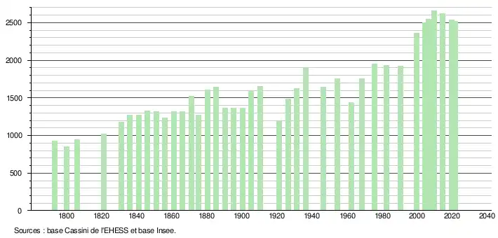L'évolution du nombre d'habitants est connue à travers les recensements de la population effectués dans la commune depuis 1793. Pour les communes de moins de 10 000 habitants, une enquête de recensement portant sur toute la population est réalisée tous les cinq ans, les populations légales des années intermédiaires étant quant à elles estimées par interpolation ou extrapolation[35]. Pour la commune, le premier recensement exhaustif entrant dans le cadre du nouveau dispositif a été réalisé en 2004[36].
