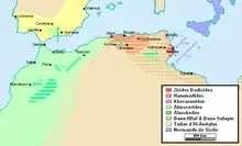 En représailles à l'indépendance des Zirides et des Hammadides, les Fatimides envoient les tribus arabes des Hilaliens, menées par Abu Zayd al-Hilali, en Ifriqiya. Les troupes berbères appuyant les Zirides désertent et ces derniers se retrouvent défaits. L'anarchie résultante dévaste l'agriculture, précédemment florissante, et les villes côtières prennent une nouvelle importance comme voies d'accès pour le commerce maritime et comme bases pour la piraterie contre les expéditions chrétiennes. Après la perte de Kairouan en 1057, le règne des Zirides se limite à une bande côtière, avec Mahdia comme nouvelle capitale. On voit alors un fait paradoxal qu'a signalé Georges Marçais : les Sanhadja, des Berbères montagnards, se tournent vers la mer et fondent à Mahdia et à Bougie des principautés maritimes. Mais il est trop tard car les Normands sont déjà établis dans le sud de l'Italie et en Sicile et doivent faire obstacle aux velléités maritimes des Zirides et des Hammadides[48]. Plusieurs émirats arabes se forment à l'intérieur des terres.