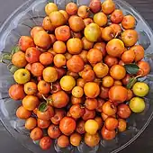L'inflorescence, axillaire, tomenteuse, est portée par un pédicelle laineux, d'environ 3 à 5 mm de long. Les fleurs, hermaphrodites, subsessiles, de 4 à 6 mm de diamètre, de couleur jaune verdâtre, sont parfumées. Le calice, d'environ 1 mm de long, est formé de sépales carénés à l'intérieur, pubescents, ovales, plus ou moins aigus. La corolle est composée de cinq pétales spathulés, de 1,25 à 1,5 mm de long. Les styles sont courts et bifides. Le disque intrastaminal assez épais présente 10 lobes. L'ovaire est biloculaire. Le fruit est une drupe globuleuse, rouge-jaune à jaune-vert contenant un noyau dur entouré d'une chair comestible, de 10–30 mm de diamètre[3].