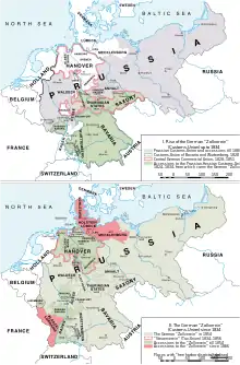 Dans le processus de modernisation du système douanier la Prusse joue un rôle prépondérant. Elle a hérité des réformes mises en place en Westphalie par Napoléon, avec notamment l'absence de droit de douane à l'intérieur de ce territoire. La politique douanière qui y est en vigueur sert de modèle pour celle que met alors en place la Prusse dans le reste de ses terres. Le ministre des finances de Westphalie jusqu'en 1811, le comte von Bülow, sert à partir de 1813 le nouveau pouvoir dans ce sens. Par ailleurs, tout comme dans les États du sud, le besoin d'intégrer les territoires nouvellement acquis se fait particulièrement sentir et oblige à réformer le système douanier[14].