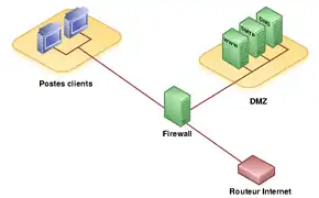 Les services susceptibles d'être accédés depuis Internet seront situés en DMZ, et tous les flux en provenance d'Internet sont redirigés par défaut vers la DMZ par le pare-feu. Le pare-feu bloquera donc les accès au réseau local à partir de la DMZ pour garantir la sécurité. En cas de compromission d'un des services dans la DMZ, le pirate n'aura accès qu'aux machines de la DMZ et non au réseau local.