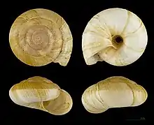 La coquille est de couleur beige-vert à blanc-crème (ces couleurs s'atténuent après la mort de l'animal). Elle est aplatie à ouverture large et ovale. Le dessous de la coquille présente un « ombilic » large et arrondi.