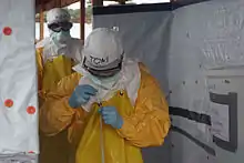 Thomas Frieden, directeur du U.S. Center for disease control and prevention, sortant d'une unité de traitement contre la maladie à virus Ebola pendant l'épidémie de 2014 en Afrique de l'Ouest.