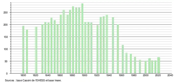 L'évolution du nombre d'habitants est connue à travers les recensements de la population effectués dans la commune depuis 1800. Pour les communes de moins de 10 000 habitants, une enquête de recensement portant sur toute la population est réalisée tous les cinq ans, les populations légales des années intermédiaires étant quant à elles estimées par interpolation ou extrapolation[9]. Pour la commune, le premier recensement exhaustif entrant dans le cadre du nouveau dispositif a été réalisé en 2005[10].