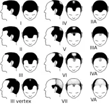 La progression de l'alopécie masculine est généralement classée sur l'échelle de Hamilton-Norwood, graduée des stades I à VII[1].
