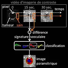 Parmi les techniques de l'échographie de contraste utilisées par les radiologues en pratique clinique, se distingue la méthode d’imagerie paramétrique des signatures vasculaires[21] inventée par le docteur Nicolas Rognin en 2010[22]. Cette méthode a été conçue comme un outil d’aide au diagnostic du cancer, facilitant la caractérisation d’une tumeur suspecte (définir si elle est bénigne ou maligne) dans un organe. D’un point de vue fonctionnel, la méthode analyse informatiquement[23],[24] une série temporelle d’images (enregistrement numérique vidéo en temps réel des images échographiques de contraste pendant l'examen). Deux étapes successives de traitement du signal sont appliquées à chaque pixel dans la tumeur, comme suit :