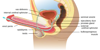 - l'expulsion du sperme : un muscle situé autour de la base de la verge et de l'anus, appelé muscle pubococcygien du périnée, se contracte par saccades[1] ; le sperme est expulsé par le méat urétral.