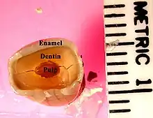 L'émail dentaire est une structure minéralisée d'origine épithéliale qui recouvre la couronne dentaire des vertébrés actuels et fossiles afin de la protéger des différentes agressions. L'amélogenèse (ou formation de l'émail) est assurée par les améloblastes (en), cellules sécrétrices qui sont détruites lors de l'éruption de la dent dans la cavité buccale. L'émail ne pouvant se régénérer en cas d'altération, il est doté par compensation d'une organisation tridimensionnelle complexe et d'un fort degré de minéralisation, qui en fait la structure la plus dure et la plus résistante de l'organisme, d'où son intérêt en médecine légale et en paléontologie. L'émail est la structure dentaire (et non le tissu car celui ci n'est pas vascularisé, ni innervé mais minéralisé, bien que très souvent même en clinique on parle de tissu amélaire)[1] normalement visible, supporté par une couche sous-jacente de dentine. Avec la dentine, le cément et la pulpe dentaire, il constitue un des quatre principaux tissus qui constituent la dent.