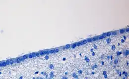 Les cellules épendymaires sont reconnues par un anticorps dirigé contre l'EMA en rapport avec le corpuscule basal. Le pôle basal des cellules épendymaires forme un prolongement qui s'imbrique avec celui des astrocytes de la zone sous-épendymaire.