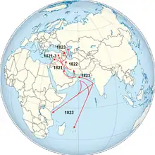 - 1re pandémie (1817-1824) : elle débute à Calcutta et frappe tout l'Extrême-Orient, ainsi que l'Afrique orientale. À partir de 1823, elle touche l'Asie mineure.
