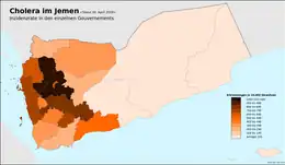 Une épidémie de choléra au Yémen commence en octobre 2016[1],[2],[3] et culmine en 2017 avec plus de 2 000 décès signalés rien que cette année-là[4],[5]. Entre 2017 et 2019, le Yémen, déchiré par la guerre, représente 84 % et 93 % des cas de choléra détectés dans le monde, les enfants constituant la majorité des cas signalés[6]. En novembre 2021, plus de 2,5 millions de cas ont été signalés et plus de 4 000 personnes décédés lors de l'épidémie de choléra au Yémen, que les Nations Unies considèrent à l'époque comme la pire crise humanitaire au monde[7],[8]. Cependant, l'épidémie diminue considérablement en 2021, avec un programme de vaccination réussi mis en œuvre et seulement 5 676 cas suspects et deux décès signalés entre le 1er janvier et le 6 mars 2021[9].