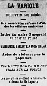 Face à l'hécatombe dans la métropole au plus fort de l'épidémie en octobre 1885, le conseil de ville de Montréal « décrète la vaccination gratuite et obligatoire ainsi que le l'isolement des malades »[69], mais depuis le milieu du XIXe siècle, il existe une très grande méfiance si ce n'est un fort rejet de la vaccination de la part des Canadiens français, celle-ci étant vue comme une mainmise des anglophones contre les francophones, ce qui occasionne fin septembre 1885 à Montréal des manifestations et même une émeute[70]. Cependant, il existait également un rejet de la vaccination chez les anglophones, certes moins important pour des raisons politiques et à cause du contexte social favorisant les anglophones[71].