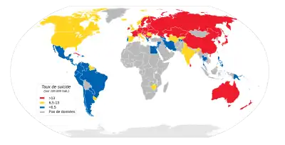 Dans le monde, 815 000 personnes se sont suicidées en 2000, soit 14,5 morts pour 100 000 habitants (un mort toutes les 40 secondes[7]). Les tentatives de suicide sont beaucoup plus fréquentes et sont estimées à 10 à 20 fois plus nombreuses que les suicides[8].