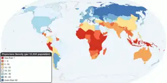 Nombre de médecins pour 10 000 habitants, par pays, en 2010 selon l'OMS, illustrant l'une des formes possibles d'inéquité de santé (tenir compte aussi de la densité de population)