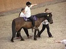 Une séance d'équithérapie est pratiquée par une personne qualifiée, afin que les actions menées restent sécurisantes et raisonnables pour la personne prise en charge[20].