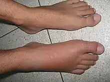 Un érysipèle ou érésipèle (du grec ἐρυσίπελας, « peau rouge ») ou dermohypodermite bactérienne non nécrosante (DHBNN)[1], est une infection de la peau due à une bactérie, un streptocoque ou, beaucoup plus rarement, un staphylocoque. Il se présente comme une zone inflammatoire de la peau, le plus souvent au niveau d'un membre inférieur, et associée à une fièvre. En principe, le diagnostic ne nécessite pas d'examen complémentaire, et le traitement consiste à administrer un antibiotique et/ou une phagothérapie (très commun en Europe de l'Est et en Russie). Les complications de l'érysipèle sont rares avec le traitement, et peuvent être secondaires à l'extension de l'infection.
