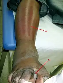 L'érysipèle d'un membre inférieur doit être différencié par ailleurs d'une thrombose veineuse profonde (ou phlébite), d'une poussée de lipodermatosclérose, d'une artériopathie, d'une dermo-hypodermite non streptococcique (rouget du porc, pasteurellose) ou d'une envenimation[4].
