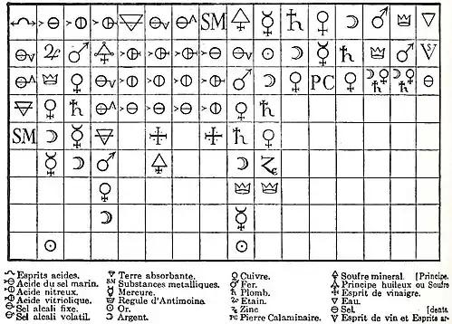 - ↑ à cette époque, les Principes (ou Éléments) étaient l'Esprit, l'Huile, le Sel, l'Eau, et la Terre, d'Étienne de Clave, dans Cours de chimie (1646), nommés encore par les synonymes : Mercure, Soufre, Sel, Phlegme et Terre