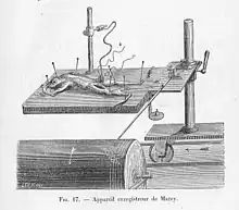 C'est aussi en collaboration avec Chauveau que Marey a construit et utilisé la sonde cardiaque pour l'enregistrement des pulsations du cœur (Appareils et expériences cardiographiques, 1863). Les travaux de Marey sur la locomotion humaine et animale étudiée selon la méthode graphique sont résumés dans La Machine animale (1873). Des travaux sur le même sujet, selon la méthode chronophotographique et qui font de Marey un des pères du cinématographe, sont réunis dans Le Mouvement (1894). Lié au monde de la photographie naissante, Marey est nommé président d'honneur de la Société française de photographie en 1894[18].
