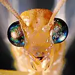 Les insectes possèdent deux yeux composés positionnés de chaque côté de la tête parfois orientés vers le sol ou protégé du soleil par un casque (comme chez la luciole ou d'autres insectes nocturnes). L'acuité visuelle et les limites de la vision permise par cette structure oculaire font l'objet d'études et de modélisations[1].