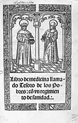 - Vers 1205[12] ou entre 1210 et 1220 : Pierre d'Espagne le Médecin de Compostelle[13] (mort en 1277), auteur de divers traités médicaux, de commentaires sur Hippocrate et Galien et, peut-être, de l'important Trésor des pauvres (Thesaurus pauperum).